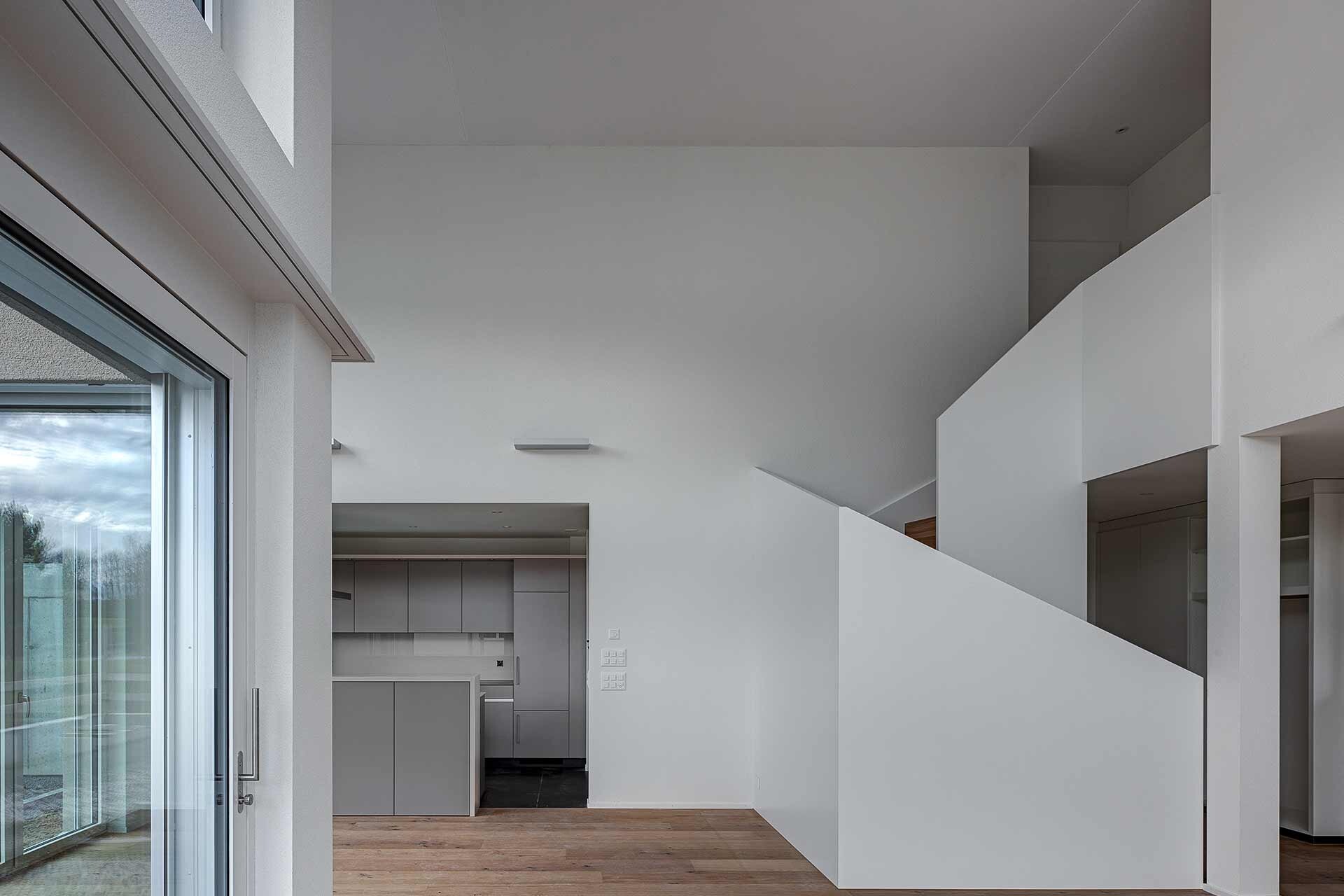 Das neue Dreifamilienhaus mit einer Einstellhalle ersetzt ein siebzig jähriges Einfamilienhaus. Eine neue Gebäudevolumetrie übernimmt den Auftakt an der Strasse und steht im Dialog mit den umliegenden stattlichen Mehrparteienhäusern. Drei verschiedene Geschosswohnungen sind über ein nordseitiges Treppenhaus mit Aufzug erschlossen. Südseitig öffnen sich die beiden oberen Einheiten mit grossen Fenstern und Balkonen zu einer imposanten Nah- und Fernsicht. Mit einem zweigeschossigen Wohnraum erhält auch die Gartenwohnung eine gleichwertige Raumqualität. Erdsonde, Photovoltaikanlage, eine gut gedämmte Gebäudehülle sowie eine verdichtete Bauweise ergeben so ein zeitentsprechendes, energieeffizientes Wohnhaus.